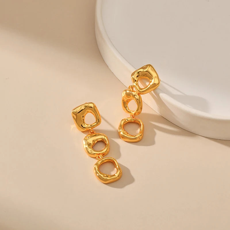 Irregular hollow design niche heavy industry metal earrings brass plated 18K gold color retention long earrings